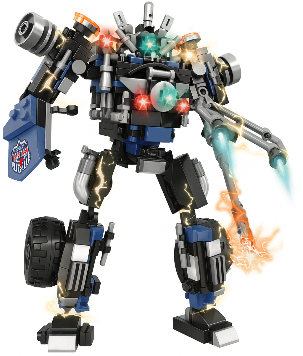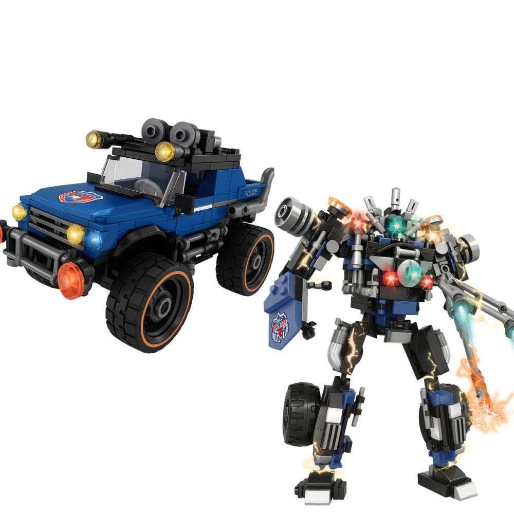 Set de construcție 2 în 1 ce permite realizarea unei mașini off-road stil poliție, care se transformă într-un robot de acțiune. Include 457 de piese și mecanism de lansare prin apăsare pentru joacă dinamică.